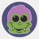 Adorable smiling goblin has green skin, funky purple hair, fangs and big sweety eyes. A fun gift for Halloween or every day.