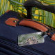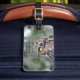 A luggage tap featuring a wide-eyed great horned owl. Personalize this luggage tap with the contact information of your choosing, such as your name, phone number, and/or email address, and use it on your next vacation.