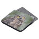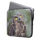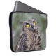A neoprene laptop sleeve featuring a wide-eyed great horned owl. This young owl was turning its head to watch a song bird. It resulted it a rather humourous wide-eyed expression.