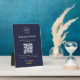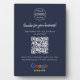 A simple custom navy blue 5x7 business tabletop easel plaque sign in a modern minimalist style, designed to feature a scannable QR code that links directly to your Google Reviews page. This versatile template can be personalized with your company logo, graphic, or photo, along with your QR code and a custom message that encourages customers to share feedback. The review platform logo can also be swapped for Yelp, TripAdvisor, Facebook, or any other site to create a bespoke and professional design that suits your business. Perfect for cafes, salons, boutiques, offices, and service-based brands, this clean display helps boost engagement and grow your reputation. Tip: Use the free GatherUp Review URL Generator to create a direct link to your review page before generating your QR code.