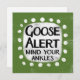 An irreverently weird typographic animal design that says "Goose Alert, Mind Your Ankles". It features black and red text on a white rectangle with funky, playful white dots surrounding it, all on a grey background.