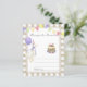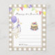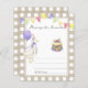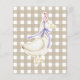 SILLY GOOSE. Watercolor kids birthday party. Watercolor cute goose in birthday hat, cake with berries, purple balloon, festive garland of flags. Beige-brown cage background.