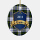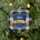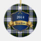Colourful plaid ceramic ornament, with the traditional blue, green, white, black, and yellow Gordon Dress tartan plaid pattern, as a background. Graphics of a blue and gold tone shield like plaque, has custom black and white text ready to personalize. Great looking family heirloom ornament. Makes a great gift ornament and decoration for other uses around the house.