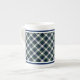 Bone china mug with the Gordon family formal dress clan tartan pattern. Traditional Scottish plaid in blue, green, and white, with yellow and black accents.