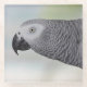 Elongated neck and a beautiful face on this Congo African Grey Parrot against a muted pastel background.