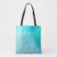 This pretty tote bag design features faux aqua mint and turquoise dripping glitter metallic texture and elegant calligraphy font.