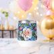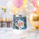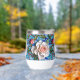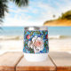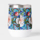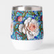 Gorgeous tumbler with a striking blue and pink faux mosaic floral pattern, featuring vibrant blue, pink and red tiles, with coral-coloured roses intertwined with green foliage. The intricate design mimics the look of a stained glass and ceramic tiles mosaic design, creating an elegant and timeless aesthetic.