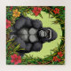 Gorilla showcased within a decorative circular frame surrounded by lush bamboo, flowers, and greenery, emphasizing tropical nature and wildlife beauty.