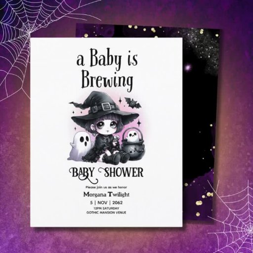 Super cute and fun Goth baby shower event item. View the full collection for matching items. Purple and Black colour theme. Included in the set are Baby is brewing, little boo on the way, invitations, diaper raffle cards, favour boxes, goody bags, signs, stickers, tshirts, thank you cards and more. The themes include: witches, ghosts, bats, crows, ghouls, gender neutral and baby boy and girl themed. Lots to choose from!