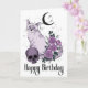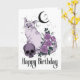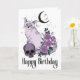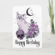 Gothic happy birthday wishes greeting card. Goth style cat with crescent moon, skull and roses in a black and purple colour scheme your Goth girl will love. Customize the text field inside for a truly magical birthday card.