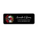 Étiquettes de adresse avec une illustration de style goth. Belles roses rouges et feuilles d'or entourant un crâne noir et blanc.