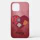 Goth themed iPhone case done in a red grunge background, with graphics of a black, red, orange and grey patched up heart. Personalize the black text to suit your needs.