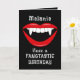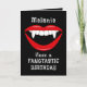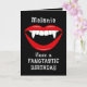 Carte d'anniversaire à thème gothique avec les lèvres et les crocs d'une femme vampire. Le texte sur le devant indique AVOIR UN ANNIVERSAIRE FANGTASTIQUE. Tout le texte à l'avant et à l'intérieur est entièrement modifiable pour ajouter vos propres noms et modifier le message si vous préférez