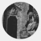 A black and white photo with a tomb and a woman mourning statue. Found in Pere Lachaise cemetery, Paris on stickers.