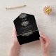 All in one gothic wedding invitation featuring your monogram initials and black and gold roses florals falling across elegant typography. The invitation includes a perforated RSVP card that features your wedding website QR code and details. Designed by Thisisnotme©