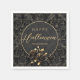 Gothic black and gold Halloween paper napkins with black and gold roses, golden handwritten old script, elegant damask pattern and oval golden frame.