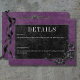 Transport your guests to a world of dark, enchanting elegance with our vintage gothic wedding details card. The deep, aged purple background sets the stage for a striking contrast, as bold white text emerges from intricate black text boxes. At the pinnacle of this invitation, a three-dimensional gothic border adorned with a regal black raven captures the essence of mystery and romance. The back is adorned with two intertwining vines of black roses subtly forming a heart around two embracing ravens, which adds a touch of dramatic allure. Unleash the magic and set the tone for an unforgettable wedding day. This card is part of the Gothic Black Raven & Black Roses Wedding Suite created by Simply Farmhouse Press.