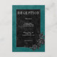 Transport your guests to a world of dark, enchanting elegance with our vintage gothic wedding reception card. The deep, aged teal background sets the stage for a striking contrast, as bold white text emerges from intricate black text boxes. At the pinnacle of this invitation, a three-dimensional gothic border adorned with a regal black raven captures the essence of mystery and romance. The back is adorned with two intertwining vines of black roses subtly forming a heart around two embracing ravens, which adds a touch of dramatic allure. Unleash the magic and set the tone for an unforgettable wedding day. This card is part of the Gothic Black Raven & Black Roses Teal Wedding Suite created by Simply Farmhouse Press.