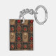 Red jewels in gold settings on a black background, with a carving of a skull in gold, creates a beautiful keychain reminiscent of an old, Gothic bookcover.