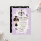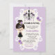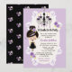 Purple, lavender and black gothic bridal shower invitations are perfect for a Halloween themed bridal shower or bachelorette party. Your guests will be delighted to receive these super cute gothic themed wedding shower invites with an elegant black and purple chandelier and cute goth girl with black lipstick and lavender eye shadow wearing an amethyst engagement ring in a gothic wedding dress with a purple corset top. Roses and flourishes add a pretty and goth touch to the artwork. A floral repeating pattern on the back. Artwork © Chrissy H. Studios, LLC. All rights reserved.
