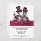 Introducing our budget-friendly invitation that sets the perfect tone for your spooky celebration! Picture a charming skeleton bride and groom standing side by side wearing elegant maroon top hats infused with floral sprigs and burgundy rose flowers.
