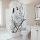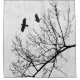 2 crows in silhouette fly past stark tree branches where 3 small birds perched are watching them. This Gothic landscape is in a white, grey and black monochrome palette. The background has a subtle grunge mottled texture pattern in the design in areas.