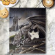 Le chaton tuxedo noir et blanc est assis à côté d'une gargouille. Derrière eux se trouve un château et des dragons.