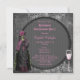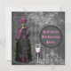 Cool and creepy Halloween Bachelorette party / hen night party invitations with a fantastic horrific skeleton bride dressed in a beautiful black, pink and green wedding gown with butterfly ornaments standing next to a pink champagne flute with black bow She is on a stylish, elegant vintage gothic black, grey and white shabby chic collage background with ornate white scroll decorations, a dragonfly, antique faded writing and stylish harlequin pattern. On the reverse of these funky goth invites is a glamourous printed black pearls and lace mat with text for you to personalize with your event details. Classy, trendy fun invites. All of the text can be easily customized to meet your needs and you can change the font style, colour and size of font if you desire. If you need any assistance customizing your product please contact me through my store and I will be happy to help. Pearl mat by ©Hazel Kinvig-Paul www.design-a-dream.co.uk Please note - all invites on Zazzle have flat printed images.
