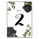 A Gothic Halloween script wedding design with black roses and hanging vines. A white Halloween design that uses black and dark botanical florals along with vintage script calligraphy typography. A stylish Gothic design ideal for Halloween wedding themes. A unique black roses wedding table number design. Matching wedding invitations and other stationery items are also available. Customize the number and purchase each tables number individually according to how many table numbers you need.