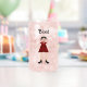 This awesome can glass features a digital art image of a creepy but beautiful Halloween Vampiress. The female vampire has long spiky black hair and is wearing a red dress adorned with a spider and decorated with black skulls, stars, diamonds and pair of black swans. She has bright red lips covered in lipstick and a sultry smile and long white fangs. She also has black fingernails, a blood red bracelet of rubies and black high heel boots with gold bows on them. Her arms are open welcoming you for an evil embrace. There is custom text so you can include your own message. The default message reads "blood"