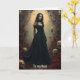 A full moon shines behind a woman in black, as she stands among skulls, flowers, and candles. A beautiful Gothic birthday card for an aunt, or anyone; the text on the front can be changed or omitted.