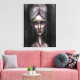 Spooky gothic decor. A gothic painting of a pale ghostly woman with redness under her eyes and pouting red lips. Her eyes are dark and sunken, and seem to hold a dark, tragic story. Her hair is carefully coifed in an elegant updo. Tendrils of pale grey hair frame her face, against a dark and ominous black background.