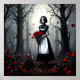 +AI ART+ Gothic robot girl with red flowers and her glitched kitty standing in a forest. Are you her true love? She's waiting for you.