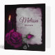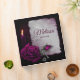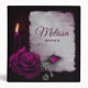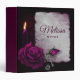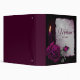 Personalized binder with a gothic look. An old greying parchment paper with hints of purple-red around the edges. A magenta rose in full bloom, a rosebud, a candle, and silver locket on a dark burgundy background creates a beautiful, dark and mysterious gothic design.