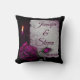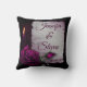 A personalized wedding pillow commemorating that special say. Designed with a gothic look. An old greying parchment paper with hints of purple-red around the edges. A magenta rose in full bloom, a rosebud, a candle, and silver locket on a dark burgundy background creates a beautiful, dark and mysterious gothic design.