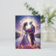 This gothic wedding save the date postcard features a skeleton couple wearing a wedding outfit with red roses and candles in a romantic setting in front of a lake at night with the moon in the background. The back of the postcard has a photo for you to change to your own photo and fill in your wedding details. Image generated with AI.