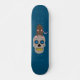 This awesome skateboard features a creepy grey skull with glowing blue eyes and rotting yellow teeth. On top of the skull is a brown rat with pink ears, tail, paws and nose and blue eyes, The rat has an arched back ready to leap out at you. A great design for rat lovers and for Halloween.