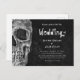 Gothic skull head vintage black and white funny Halloween design wedding postcard invitation. Fun, spooky, cool Hallowedding. Image copyright Marg Seregelyi Photography.