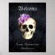 Transform your home into a Halloween haunted lair with our unique Halloween Welcome poster . Design features gothic floral skull on a black textured background with the words "Welcome to our Haunted lair. The skull is accented with beautiful purple roses. Personalize with your text.