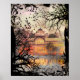 An ornate gothic frame with elegant scrollwork and tree-branch silhouettes surrounds a picturesque scene of a garden solarium in autumn hues, which sits next to a pond reflecting the rosy sunset and a flock of dark birds.
