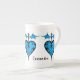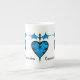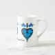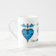 Elegant heart in black and blue and textured with a grungy medieval print has a bat winged fancy stake through it. I shaded one side of the design. Item will print clearer than shown. On a bone china mug. Add your name to both sides. Art (c) LR 2012 All rights reserved.