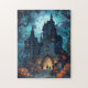 Un puzzle d'Halloween sombre, gothique, légèrement humoristique, avec un château hanté en ruine au crépuscule, des sorcières volant sur des baguettes, des citrouilles brillants et des chauves-souris dans un style d'illustration vintage de livre de contes. Puzzle amusant en famille !