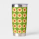 Un tondeuse thermique en acier inoxydable branché pour vos boissons chaudes ou froides, avec l'image d'une fleur jaune Dahlia imprimée en motif extensible sur un arrière - plan vert citron. Un design floral et amusant !
