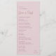 Modern wedding program featuring a simple and minimal geometric design with a vertical line along the left side with your details in left alignment. Your names are in a handwriting script for an elegant touch. In the bottom right corner is your two initial monogram over a small horizontal line. The colour palette may be changed in the design editing tool.