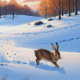 In this picturesque scene, a majestic hare dashes across a snow-laden field in the soft winter sunlight. This stylized watercolour image encapsulates the untamed beauty of nature, inviting you to embrace the serenity and vitality of the winter woods.