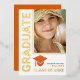 Custom graduation invitations featuring your photo and a bit of faux orange glitter glam and real foil accents that are easy to personalize. Create your own graduation party or graduation ceremony invitations by adding your photo and your graduate's name in orange text next to the faux glitter orange graduation cap graphic. GRADUATE in bold typography style lettering along the left side of the custom invitation as well as CLASS OF 20XX where you can add your graduate's school year and the thin border around your photo are all printed in real foil for the bling factor. Each personalized graduation invitation reverses to a solid orange background with a text template in white lettering where you can add all your party invitation details.