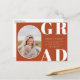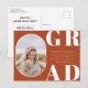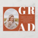 Rounded front photo frame, senior class graduation announcement/invitation. Solid rust orange colour background, white bold type "GRAD" and text template lines for graduate's name, class of year and school. Back of card features additional text lines for party information or other information about the graduate.