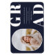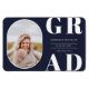 Rounded photo frame, senior class graduation announcement magnet. Navy blue colour background, white bold type "GRAD" and text template lines for graduate's name, class of year and school.