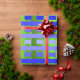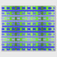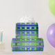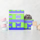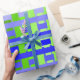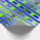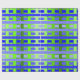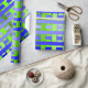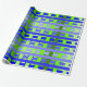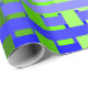 This wrapping paper has a geometric design of lines in shades of blue and green woven to make a plaid.
