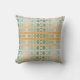 This throw pillow has a geometric design of lines in shades of teal and orange woven to make a plaid.